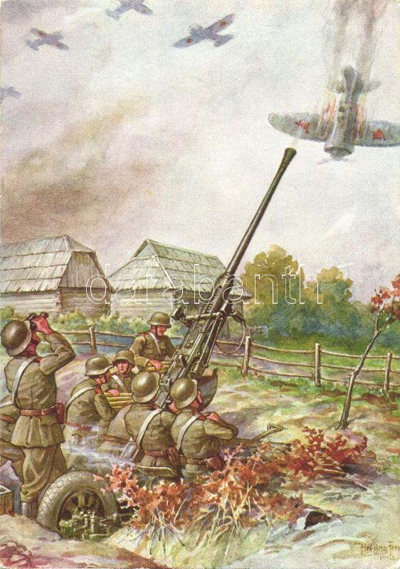Marton Ferenc szakaszvezető gépágyújára támadó öt ellenséges repülőgéppel szembeszáll / Military WWII Officer Ferenc Marton fighting aeroplanes s: Helbing Ferenc (b)