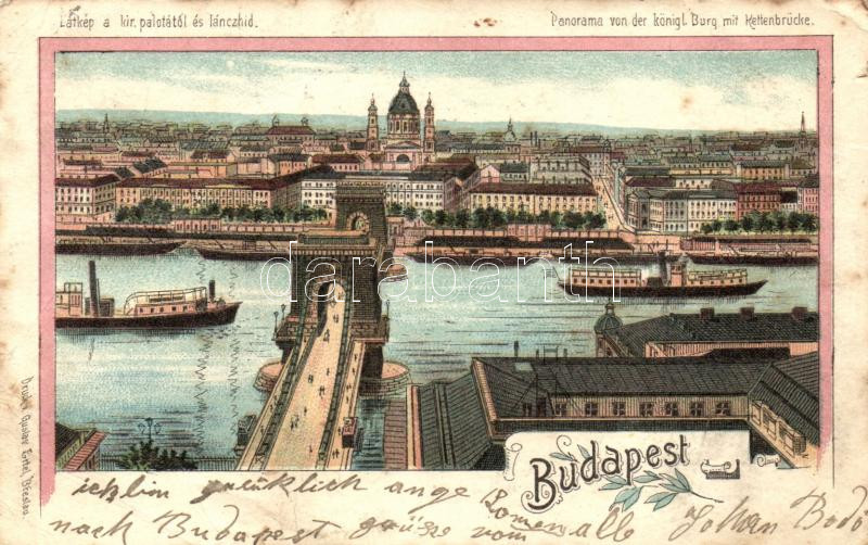 Leírás: Budapest, Lánchíd, Királyi palota litho (b)