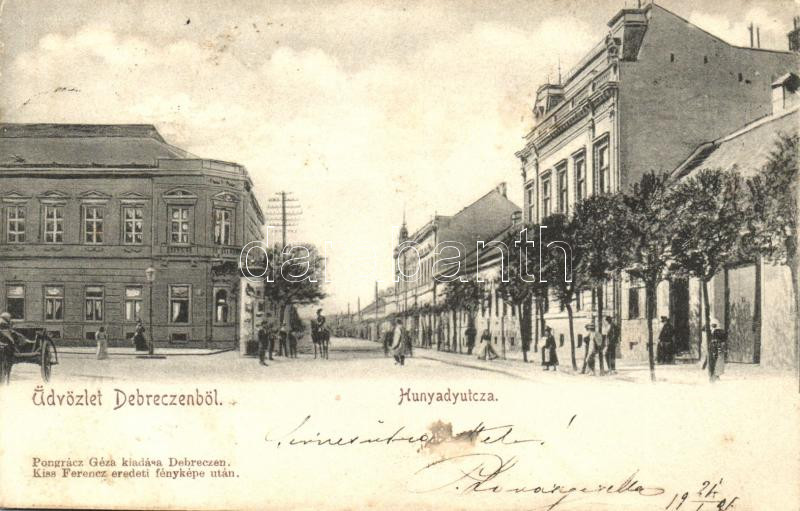 Debrecen, Hunyadi utca; Pongrácz Géza kiadása https://www.darabanth.com/hu/224-Gyorsarveres/224.0/Kepeslapok/Magyarorszag~10006/Debrecen-Hunyadi-utca-Pongracz-Geza-kiadasa~II984698