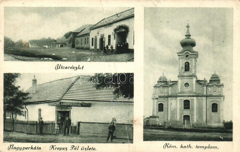 Nagyperkáta templom, Krepsz Pál üzlete (fa) https://www.darabanth.com/hu/224-Gyorsarveres/224.0/Kepeslapok/Magyarorszag~10006/Nagyperkata-templom-Krepsz-Pal-uzlete-fa~II985339