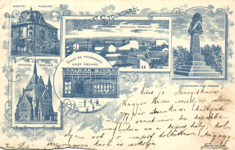 Leírás: Szolnok, Megyei kaszinó, Kalmár Miksa Divatáruháza, Szabadság Honfi szobor, Art Nouveau (b)
