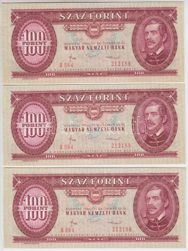 1984. 100Ft (4x) sorszámkövetők T:I,II https://www.darabanth.com/hu/224-Gyorsarveres/224.0/Numizmatika/Magyar-bankjegyek~20007/1984-100Ft-4x-sorszamkovetok-TI-II~II976485