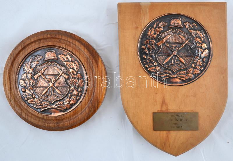Leírás: 1993. "Önk. Váll. Tűzoltóverseny 1993. Soponya" Br plakett fa talapzaton (25x17cm) + DN Br Tűzoltó plakett kör alakú fa talapzaton (17cm) T:2