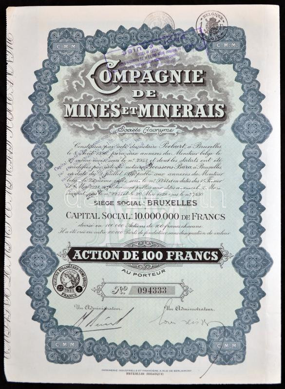 Belgium/Brüsszel 1928. "Bányák és Ásványok Vállalat" részvénye 100Fr-ról, francia és belga bélyegzésekkel, szelvényekkel T:II