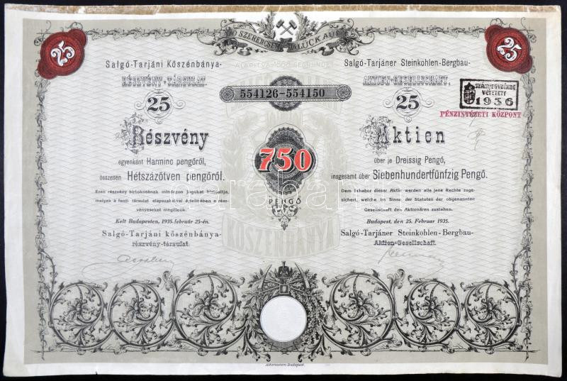 Leírás: Budapest 1935. "Salgó-Tarjáni Kőszénbánya Részvény-Társulat" részvénye egyenként 30P-ről, összesen 750P-ről, szárazpecséttel, bélyegzéssel, szelvények NÉLKÜL! T:II-