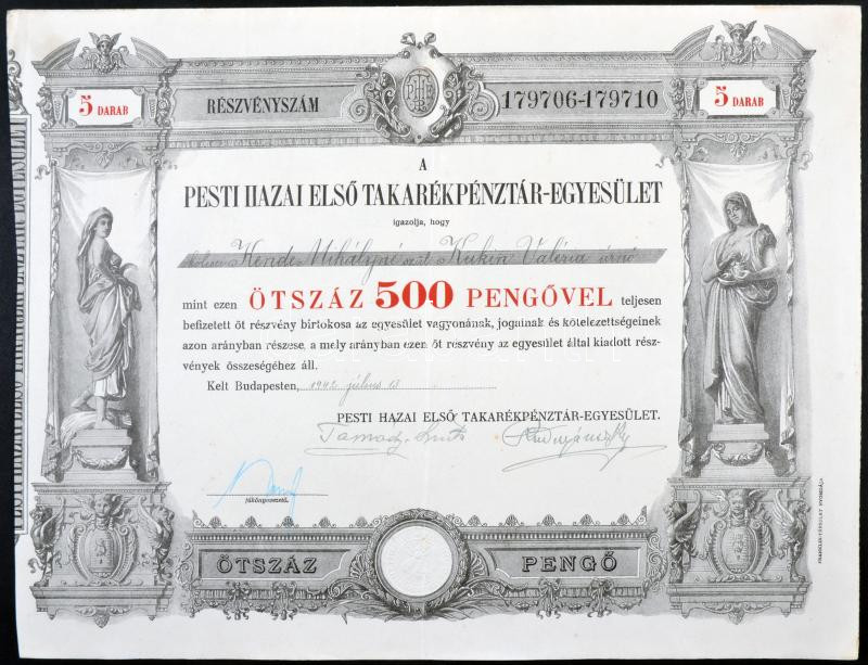 Budapest 1942. "Pesti Hazai Első Takarékpénztár-Egyesület" 5 részvénye... https://www.darabanth.com/hu/224-Gyorsarveres/224.0/Numizmatika/Reszvenyek-es-sorsjegyek~20005/Budapest-1942-Pesti-Hazai-Elso-Takarekpenztar-Egyesulet-5-reszvenye-osszesen-500P-rol-sz~II976478