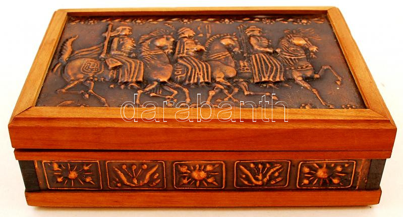 Leírás: Réz berakással gazdagon díszített fadoboz, 14×10×5 cm