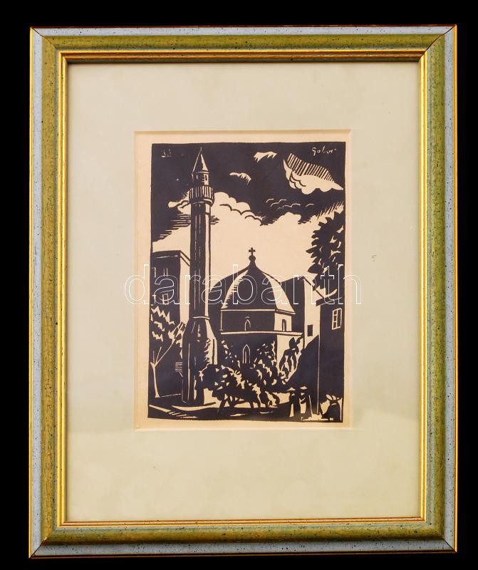 Leírás: Gábor Jenő (1893-1968): A pécsi minaret. Linó, papír, üvegezett keretben, 15×11 cm