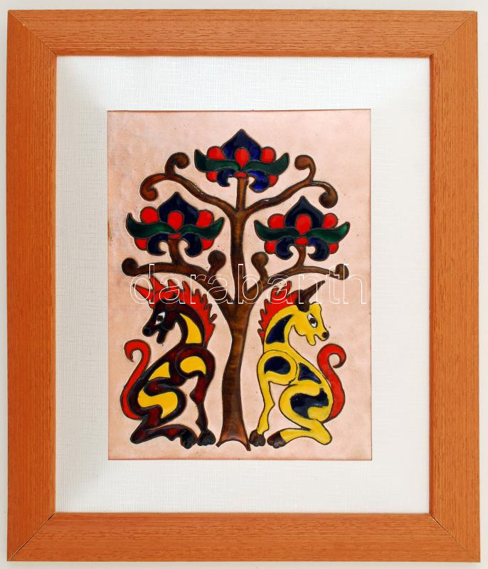 Leírás: Jelzés nélkül: Varázslovak. Tűzzománc, fém, jelzett, keretben, 14x19 cm