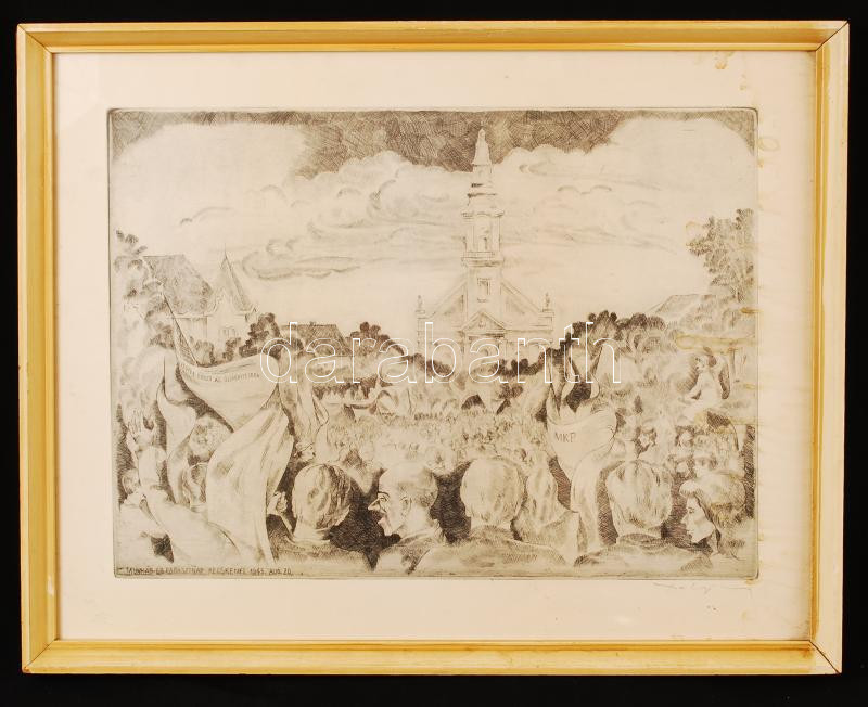 Leírás: Olvashatatlan jelzéssel: Munkás és parasztnap Kecskemét 1945. aug. 20. Rézkarc, papír, jelzett, üvegezett keretben, 38x29 cm
