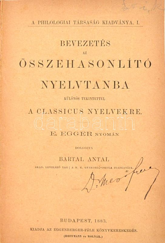 Bartal Antal: Bevezetés az összehasonlító nyelvtanba különös tekintettel a classicus nyelvekre. E. Egger nyomán dolgozta - -Budapest, 1883, Eggenberger féle Könyvkereskedés. Félvászon kötésben. Tulajdonosi jegyzetekkel.