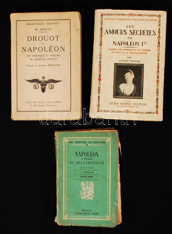 3 db Napóleonról szóló könyv: Meyrac, Albert: Les amours secrètes de Napoléon Ier d'après les pamphlets de l'époque et ceux de la restauration. Párizs, [1925], Albin Michel (Chroniques indiscrètes et galantes d'autrefois). Kicsit szakadt papírkötésben.; Napoléon a bord du "Bellérophon". Souvenirs du capitaine de vaisseau F. L. Maitland, et de l'aspirant de marine George Home. Párizs, 1934, Les petits-fils de plon et nourrit (Les témoins de l'épopée 3.). Papírkötésben, a gerince és az elülső kötéstábla félig elválik; Sérieyx, W.: Drouot et Napoléon. Vie héroïque et sublime du général Drouot. Párizs, 1929, J. Tallandier. Kicsit szakadt papírkötésben, egyébként jó állapotban.