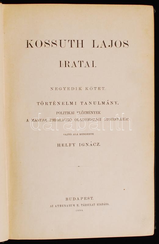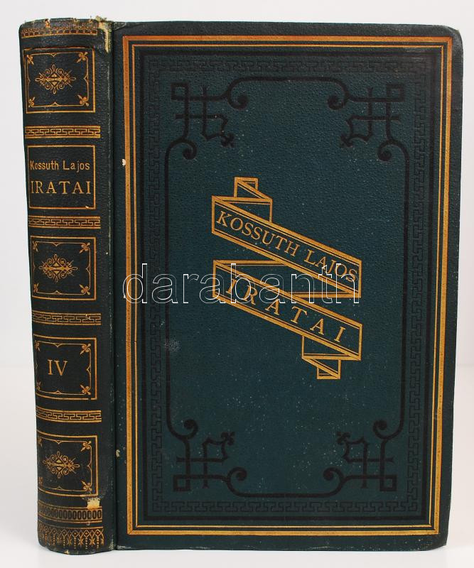 Kossuth Lajos iratai. IV. kötet. Sajtó alá rendezte Helfy Ignácz. Bp. 1894, Athenaeum. Aranyozott, festett borító, festett lapszél, dombornyomásos kiadói egészvászon-kötésben. Gerince az egyik saroknál kicsit szakadt, egyébként jó állapotú.