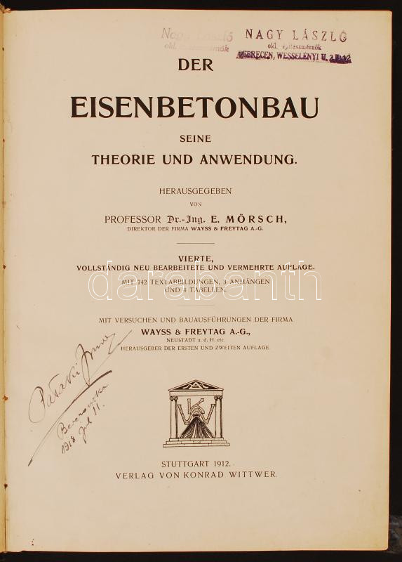 Mörsch, E.prof. dr.: Der Eisenbetonbau seine Theorie und Andwendung. Vierte, Vollstandig neu bearbeitete und verhmehrte Auflage. Mit 742 Textabbildungen, 3 Anhangen und 4 Tabellen. Stuttgart, 1912, Konrad Wittwer. Félvászon kötésben. Ceruzás tulajdonosi megjegyzésekkel ill pecséttel. jó állapotú.