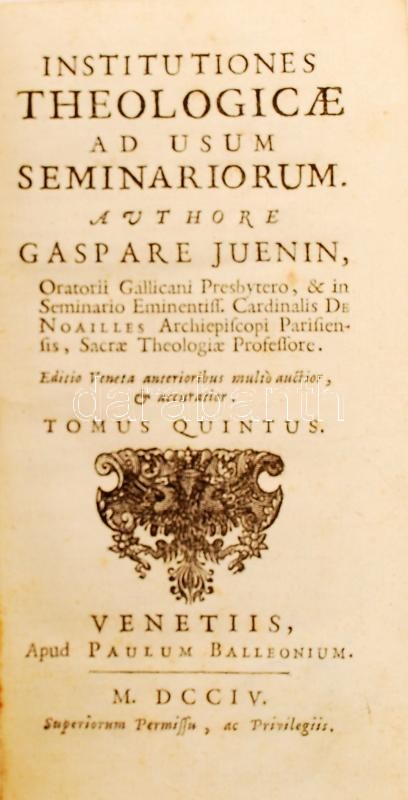 Institutiones Theologicae Ad Usum Seminariorum. Auctore Gaspare Juenin. Tomus Quintus. Venetis, 1804, Paulum Balleonium. Karton kötésben, kicsit foltos, de jó állapotban.