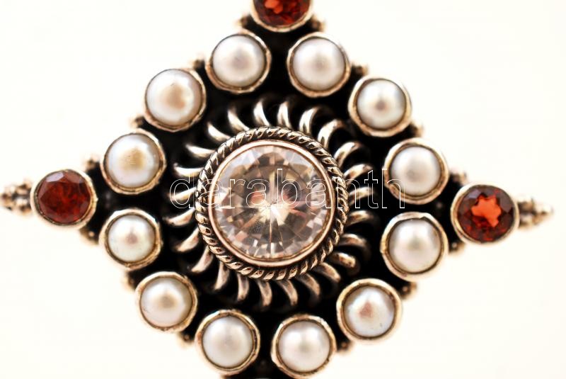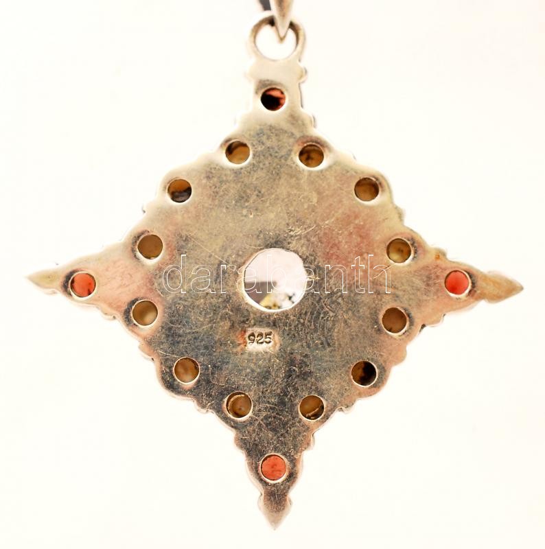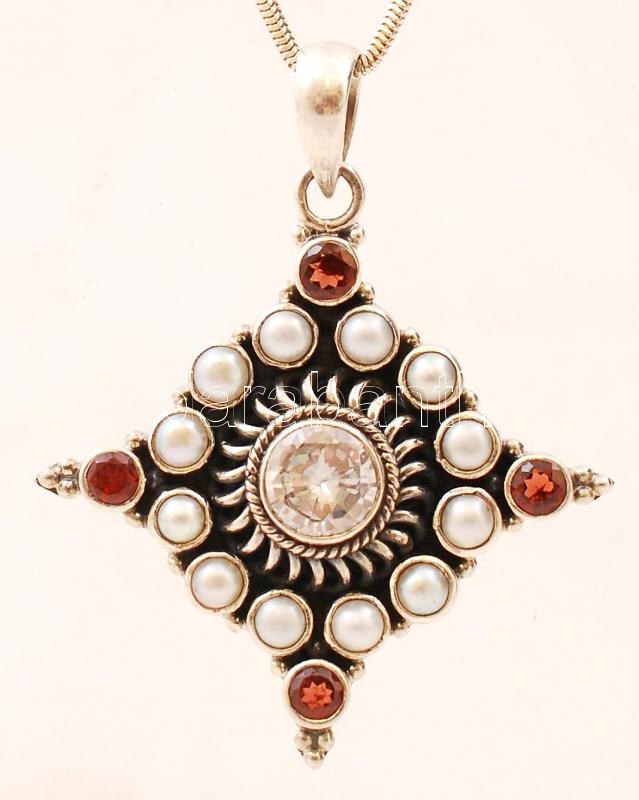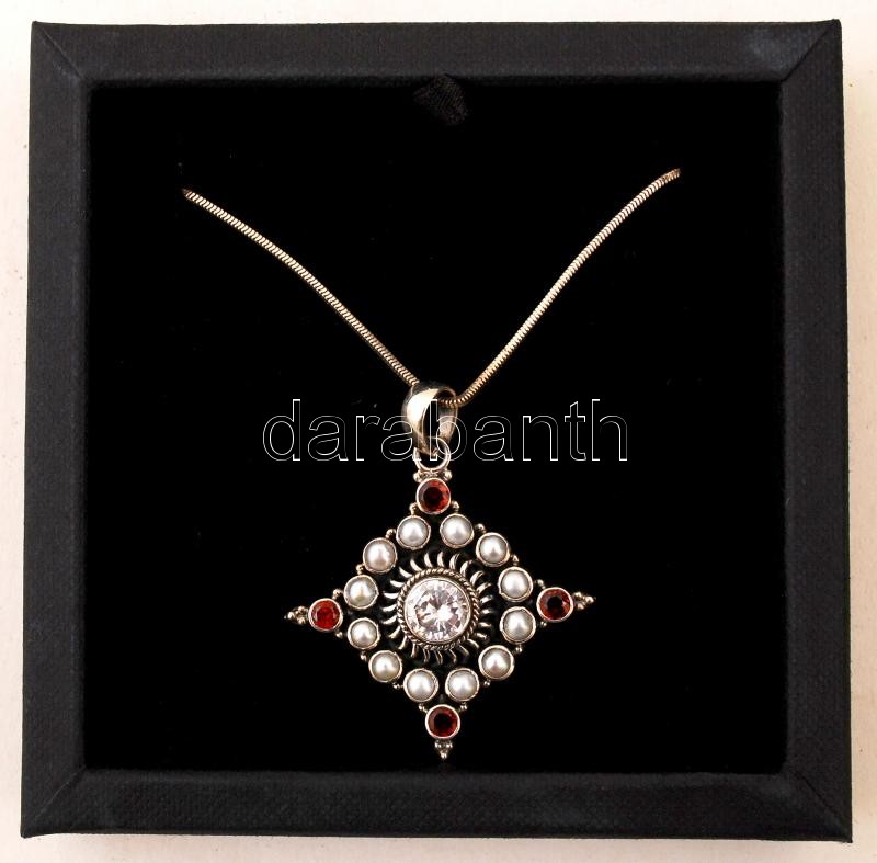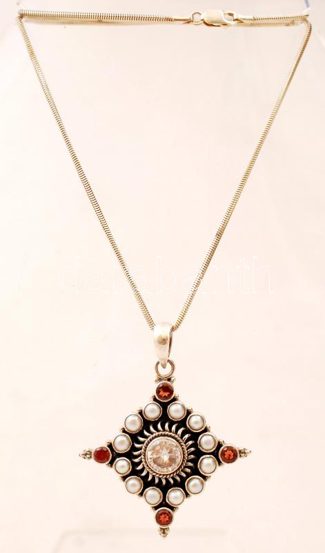 Leírás: Gyönggyel és kövekkel kirakott ezüst (Ag) medál ezüst (Ag) láncon, jelzett, br: 18,1 g