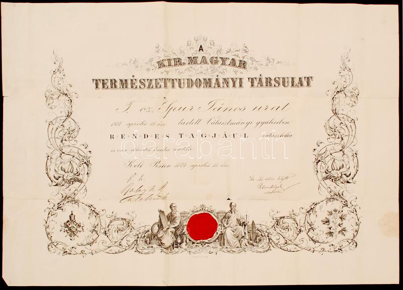 Leírás: 1874 A Kir. Magyar Természettudományi Társulat Spur János urat 1874 április 15 tartott Választmányi gyűlésén Rendes tagjául választotta. 46x63cm