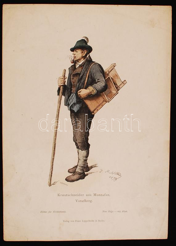 1887 Krautschneider aus Montafun- Vorarlberg. Színezett fa metszet a Blatter für Kostumkunde c. könyvből. Jelzett a metszeten. 28,5x20cm / Cabbage cutter from Montafun- Vorarlberg. Colored wood engraving. Signed on engraving.
