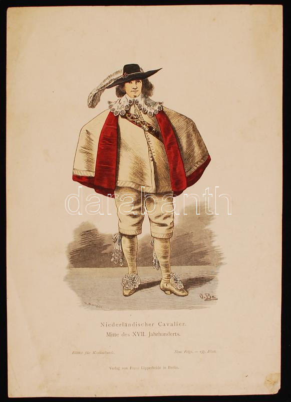 1887 Niederlandischer Cavalier. Színezett fametszet a Blatter für Kostumkunde c. könyvből. Jelzett a metszeten. 28,5x20cm / Knight from Holland. Colored wood engraving. Signed on engraving.