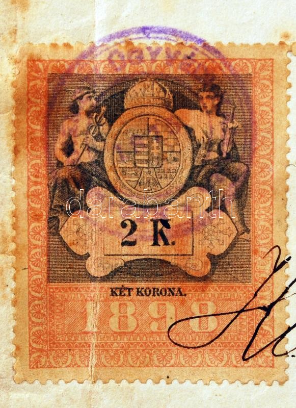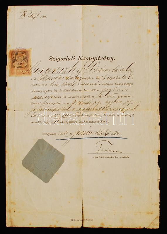 1900 Bp., Szigorlati bizonyítvány a jogtudományi doktori fokozat elnyerése céljából tett első szigorlati vizsga sikeres teljesítéséről, okmánybélyeggel, szárazpecséttel
