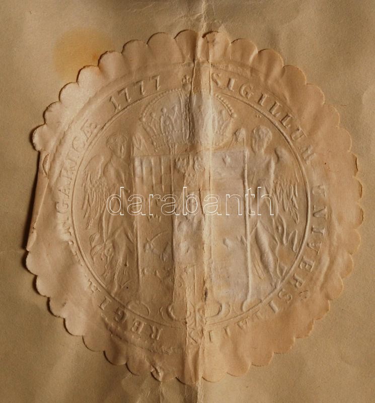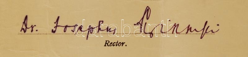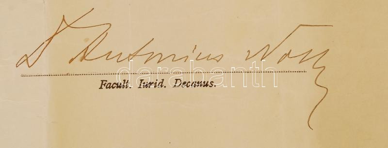 1923 A Pázmány Péter Tudományegyetem díszes jogi doktori kinevezési oklevele, rányomott szárazpecséttel, az egyetem rektorának és a jogi kar dékánjának aláírásával, egy helyütt szakadással.