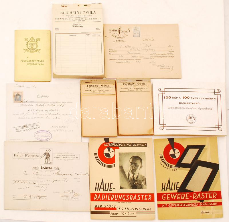 Leírás: cca 1911-1940 Vegyes okmány tétel: 10 db régi számla, nyugtatömb, és egyéb papírok, pl. kéményseprőszámla