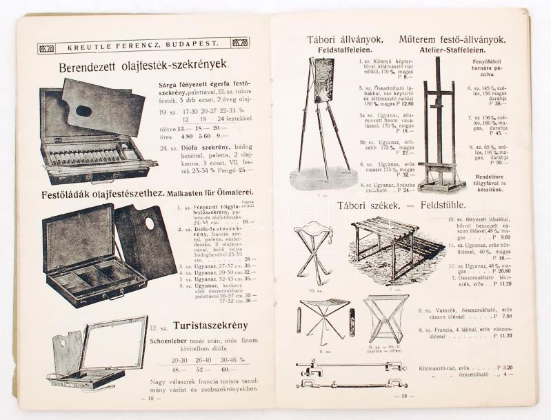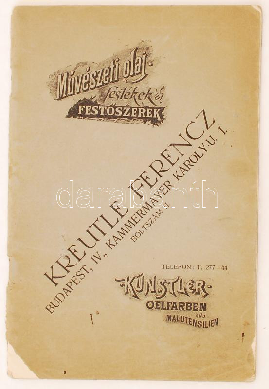 Leírás: Kreutle ferencz Árjegyzéke: Művészeti olaj-festék és festőszerek. Rajzokkal illusztrált reklám kiadvány.