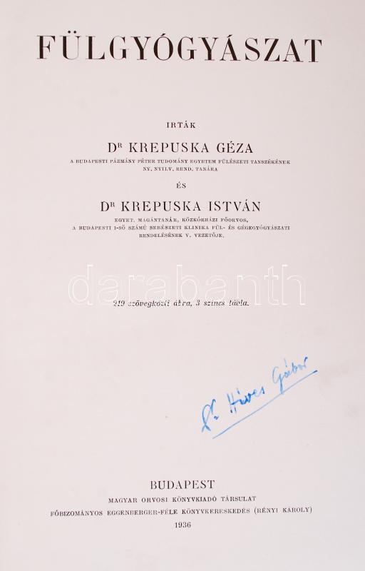 Dr.Krepuska Géza-Dr.Krepuska István: Fülgyógyászat. 219 szövegközti áb... https://www.darabanth.com/hu/225-Gyorsarveres/225.0/Festmeny-mutargy-papirregiseg-egyeb/c~1/DrKrepuska-Geza-DrKrepuska-Istvan-Fulgyogyaszat-219-szovegkozti-abra-3-szines-tabla-~II935614