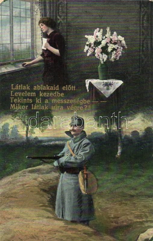 Leírás: WWI Romantic military card, soldier with his lover (EK)