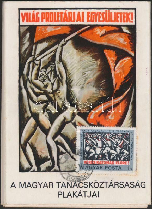 A Magyar Tanácsköztársaság plakátjai - 16 db reprint művészi propagandalap hozzá illő bélyegekkel és az 1979-es Bélyegkiállítás pecsétjével; saját papírtokjában / Hungarian Soviet Republic - communist propaganda, 16 reprint art postcards in paper case and matching stamps