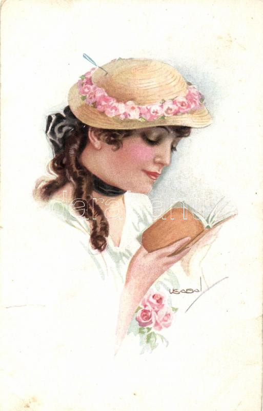 Leírás: Italian art postcard, reading lady, "Erkal" Küstler-Serie 308/5. s: Usabal (fa)
