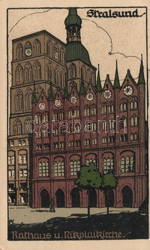 Leírás: Stralsund, Rathaus und Nikolaikirche; Künstler Steinzeihnung / town hall, church