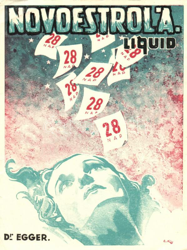 Leírás: Novoestrol "A" Liquid menstruációs problémákra, reklám / medicine advertisement s: C. Kiss (12.5 x 17 cm) (small tear)