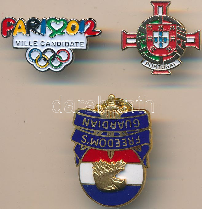 Leírás: Hollandia DN "A Szabadság Őre" zománcozott fém jelvény, "L 22" jelzéssel + Portugália DN "Portugal" zománcozott fém jelvény + Franciaország 2012. "Párizs 2012 - Olimpiai jelölt város" zománcozott fém jelvény T:1-