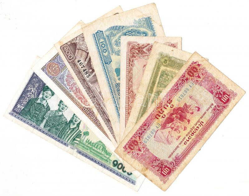 Laos 1974-1979. 10 Kip (2x) + 1974-1975. 100 Kip (2x) + 1979. 20 Kip + 1988. 500 Kip + 1992-2003. 1000 Kip C:F