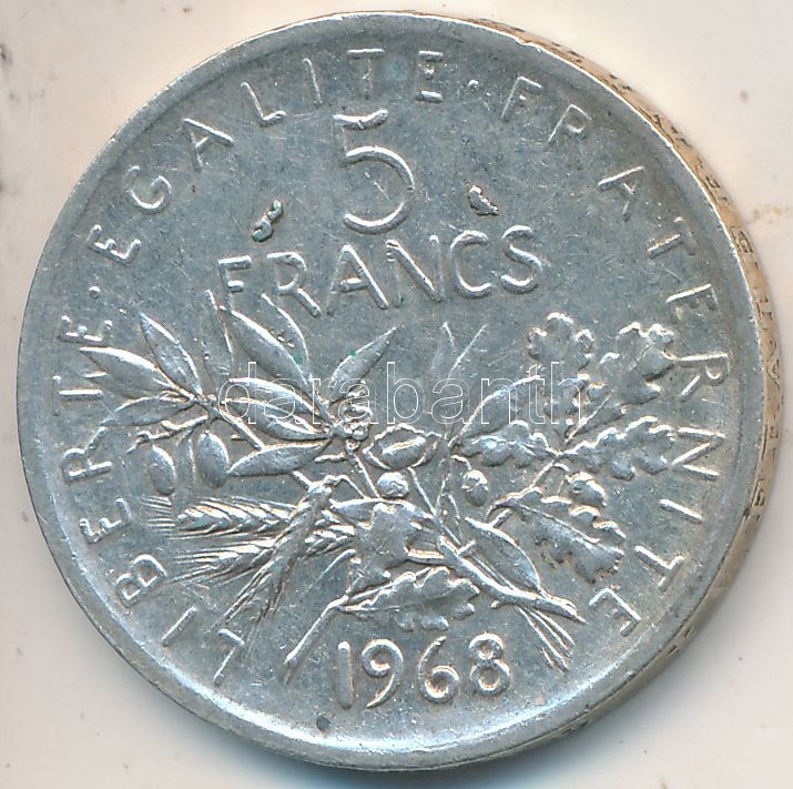 Krause KM... https://www.darabanth.com/hu/225-Gyorsarveres/225.0/Numizmatika/Kulfoldi-fem-es-ezustpenzek~58/Franciaorszag-1968-5Fr-Ag-T2-3Cbr3EFrance-1968-5-Francs-Ag-CXF-3Cbr3EKrause-KM23-926~II991799