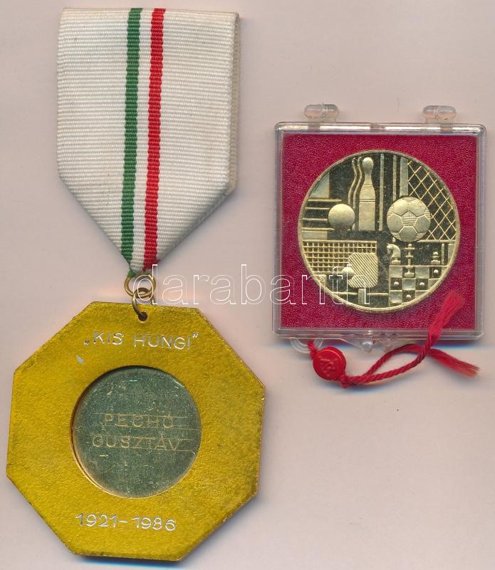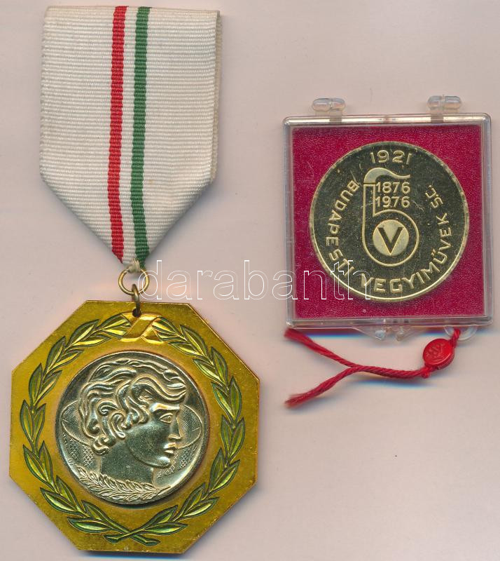 Leírás: 1976. "Budapesti Vegyiművek SC" aranyozott emlékérem plombált ÁPV plasztiktokban + 1985. Névre szóló fém díjérem mellszalagon (59x59mm) T:PP,2