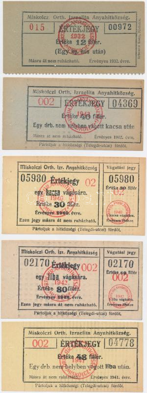Leírás: 1932-1942. 12f-80f (5xklf) "Miskolczi Orthodox Izraelita Anyahitközség" liba és kacsa vágatási bárcák T:I-