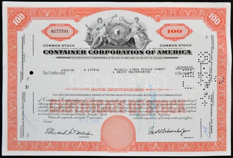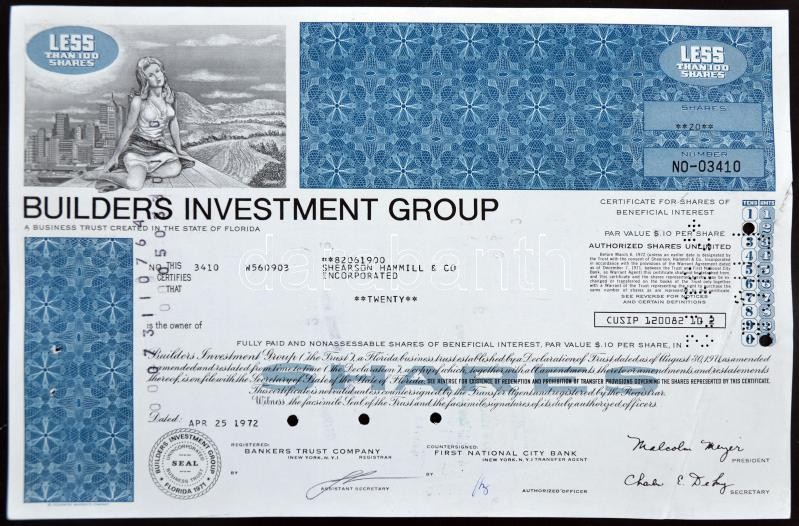 Canada 1975. "Massey-Ferguson Limited" certificate about a 100 fully paid shares, perforated and cancelled with holes + USA/Delaware 1968. "Container Corporation of America" certificate about a 100 fully paid shares, perforated and cancelled with holes + Florida 1972. "Builders Investment Group" certificate about 20 fully paid shares, perforated and cancelled with holes + Maryland 1977. "The Great Atlantic & Pacific Tea Company, Inc." certificate about 2709 fully paid shares, perforated and cancelled with holes C:XF,VF