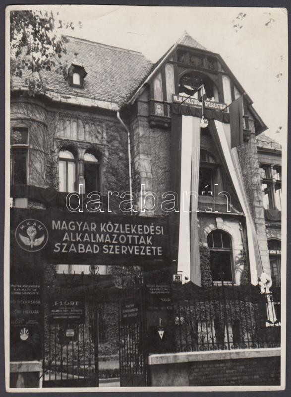 Leírás: cca 1948-1950 Tiszavölgyi József: A Magyar Közlekedési Alkalmazottak Szabad Szakszervezetének székháza, pecséttel jelzett fotó, 13x17 cm