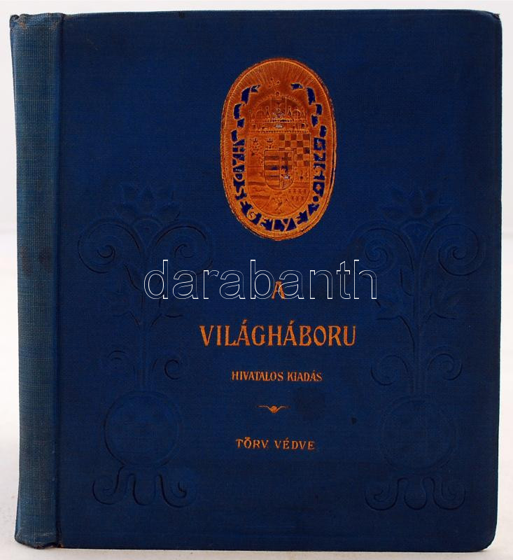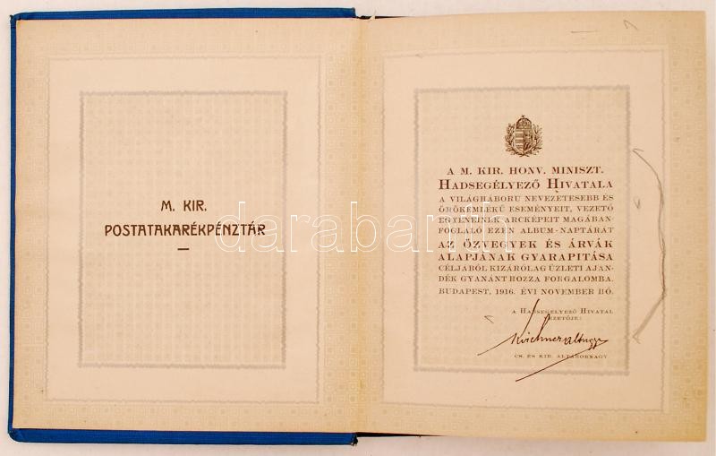 A világháború. M. Kir. Honv. Minisztérium HadsegélyezÅ‘ Hivatala a világháború nevezetesebb és örökemlékű eseményeit, vezetÅ‘ egyéneinek arcképeit magában foglaló ezen album-naptárát az özvegyek és árvák alapjának gyarapÃtása céljából kizárólag üzleti ajándék gyanánt hozza forgalomba. Szekszárd, 1916. Molnár. 114 sztl. p. (ebbÅ‘l 56 oldal kép). Kiadói, aranyozott, dombornyomásos egészvászon kötésben, a képes naptár lapok perforált naptár része nélkül. Jó állapotú.