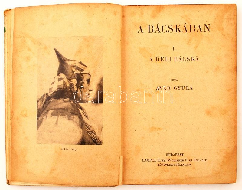 Avar Gyula: A Bácskában. I. A déli Bácska. Utazások Nagymagyarországon. Budapest, é.n., Lampel. Kiadói karton kötésben, Viseletes fedőborító és gerinc.
