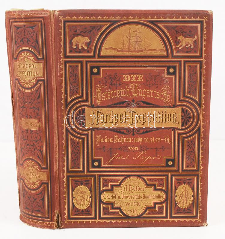 Julius Payer: Die österreichisch-ungarische Nordpol-Expedition in den Jehren 1872-1874, nebst einer Skizze der zweiten deutschen Nordpol-Expedition 1869-1870 und der Polar-Expedition von 1871. Mimt 146 Illustrationen und 3 Karten. Wien, 1876, Ulfred Hölder. Kiadói aranyozott egészvászon kötés, gerincnél szakadt, belül levált, festett lapszélek, kopottas állapot.