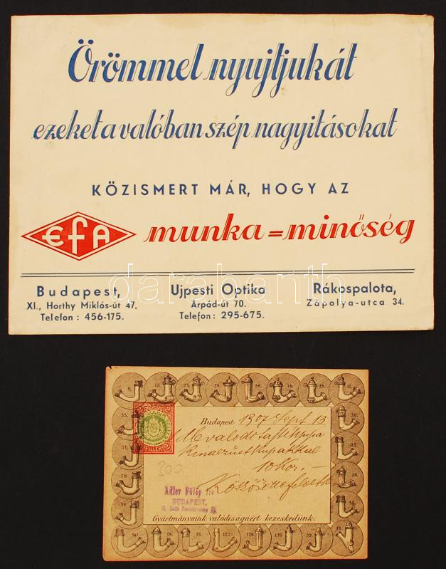 EFA Újpesti Optika borítéka, Adler Fülöp és Fia által kiállított dísze... https://www.darabanth.com/hu/226-Gyorsarveres/226.0/Festmeny-mutargy-papirregiseg-egyeb/Reklam~400041/EFA-Ujpesti-Optika-boriteka-Adler-Fulop-es-Fia-altal-kiallitott-diszes-fejlece-szamla~II1002777