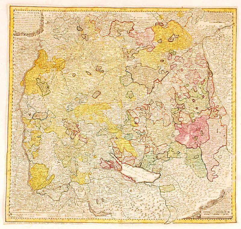 Leírás: 1743 Homann: Kolorierte Kupferstichkarte " Circuli Sveviae Mappa ex subsidiis Michalianis delineata..., Sváb Hercegség térképe, 55x52 cm