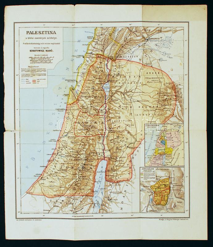 Leírás: Palesztina a bibliai események színhely, tervezte Kogutowicz Manó, Magyar Földrajzi Intézet Rt., 33x38 cm