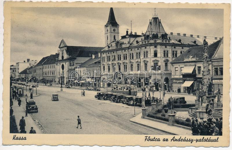 Kassa, Fő utca, Andrássy palota / Main street, palace, drugstore https://www.darabanth.com/hu/226-Gyorsarveres/226.0/Kepeslapok/Felvidek~50007/Kassa-Fo-utca-Andrassy-palota-Main-street-palace-drugstore~II852915