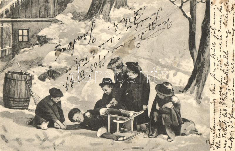 Sleighing children, accident, humour https://www.darabanth.com/hu/226-Gyorsarveres/226.0/Kepeslapok/Gyerek~400102/Sleighing-children-accident-humour~II1000318