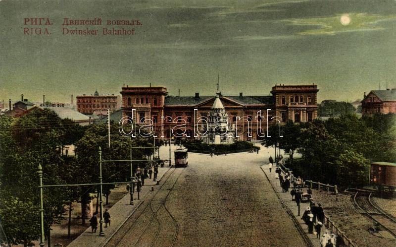 Riga, Dwinsker Bahnhof / railway station, tram at night (EK) https://www.darabanth.com/hu/226-Gyorsarveres/226.0/Kepeslapok/Lettorszag~400092/Riga-Dwinsker-Bahnhof-railway-station-tram-at-night-EK~II921843
