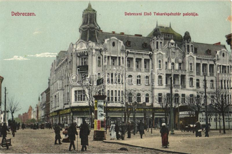 Leírás: Debrecen, Első Takarékpénztár palotája, Kotsek Kornél üzlete, Ifj. Gyürky Sándor kiadása